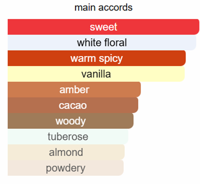 Base notes are Tonka Bean, Cacao, Vanilla, Praline, Sandalwood, Musk, Amber, Cashmere Wood, Patchouli, Cinnamon and Cedar
